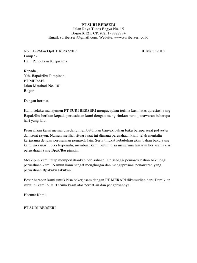 15 contoh surat balasan menolak kerjasama terlengkap 2019.